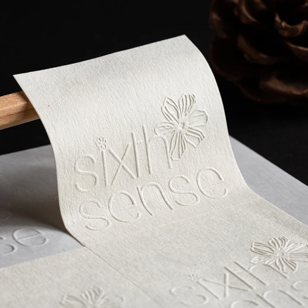 Crafted from premium 120gsm uncoated cotton paper, each sticker has a soft matte texture and elegant weight that feels as good as it looks. Your design is engraved onto metal plates and professionally pressed into the paper to create a timeless embossed impression.